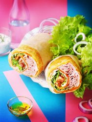 - Dès la sortie du four, retournez le wrap sur un autre papier cuisson, enroulez-le sur lui-même et laissez refroidir avant de le dérouler et de le garnir selon vos goûts. Par exemple, tartinez-le côté carotte de fromage frais, ajoutez des feuilles de salade verte, des quartiers de tomate et des tranches de blanc de poulet ou de jambon.