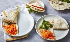 Wrap hack de carottes râpées, mâche, poulet émincé, crème fraiche