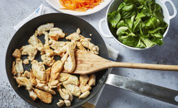 - Émincer le poulet et le faire revenir dans une poêle pendant 5 à 7 minutes avec un filet d’huile d’olive jusqu’à ce qu’il soit bien doré.