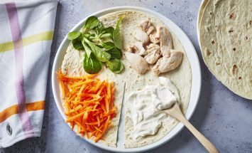 Couper la tortilla sur un rayon et déposer une cuillère à soupe de crème fraîche sur le premier quart en partant de la droite. Continuer en déposant du poulet émincé. Sur le troisième quart, ajouter quelques feuilles de mâche et terminer par des carottes râpées. Répéter l’opération pour toutes les tortillas.