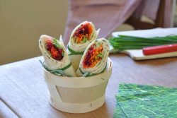 - Coupe-les en biais en deux parties égales puis présente-les à tes convives. Tu peux entourer les wraps d’un brin de ciboulette pour faire joli.S’il te reste de la carotte et de la betterave, prépare-les en salade avec une vinaigrette à l’huile de noix ou de noisette ; un délice !