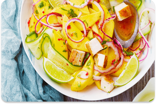 Elle pousse aujourd’hui dans toutes les régions tropicales, mais la mangue vient à l’origine d’Inde. Elle possède un gout unique et une chair parfumée. On peut la manger crue ou dans des desserts, sans négliger son utilisation dans des plats sucrés-salés tels qu’une salade concombre-mangue-poulet. Un régal !