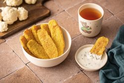 Mélanger la purée de chou-fleur avec le quinoa, 2c. à soupe de maïzena, 1 c. à café de de curry et 1 c. à soupe d’huile d’olive.