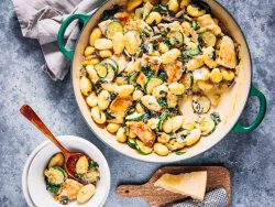 Ajoutez le cube de bouillon émietté, l’eau et la crème. Portez à ébullition, ajoutez les gnocchis, mélangez, baissez à feu moyen et laissez cuire encore 10 minutes.