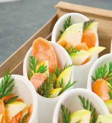 Dresser dans des verrines. Décorer d’un peu de fanes de carottes ciselées et servir en pièce cocktail ou en accompagnement d’une viande blanche rôtie.