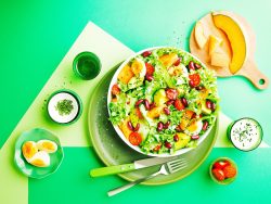 Lavez la demi-batavia, essorez-la et déchirez-la grossièrement. Lavez la courgette puis taillez-la en fines lanières à l’aide d’un économe ou d’une mandoline. Épluchez et coupez l’avocat et le demi-melon en gros dés. Coupez les tomates cerises en deux.